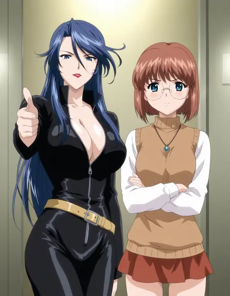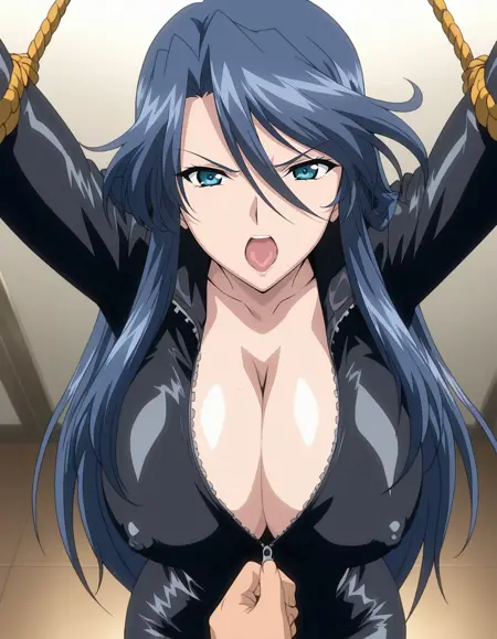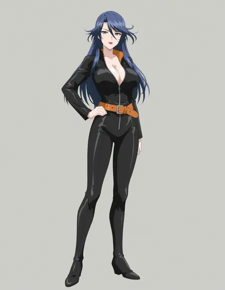 mai_rfsda,mai_reirf,mature_female,age_up,long_hair,dark_blue_hair,blue_eyes,mole_under_eye,large_breasts,red_lips,black_bodysuit,belt,zipper,cleavage