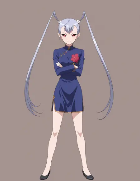 mai_rfsda,mai_koryuurf,long_hair,twintails,grey_hair,red_eyes,pointy_ears,blue_china_dress,long sleeves,short_dress
