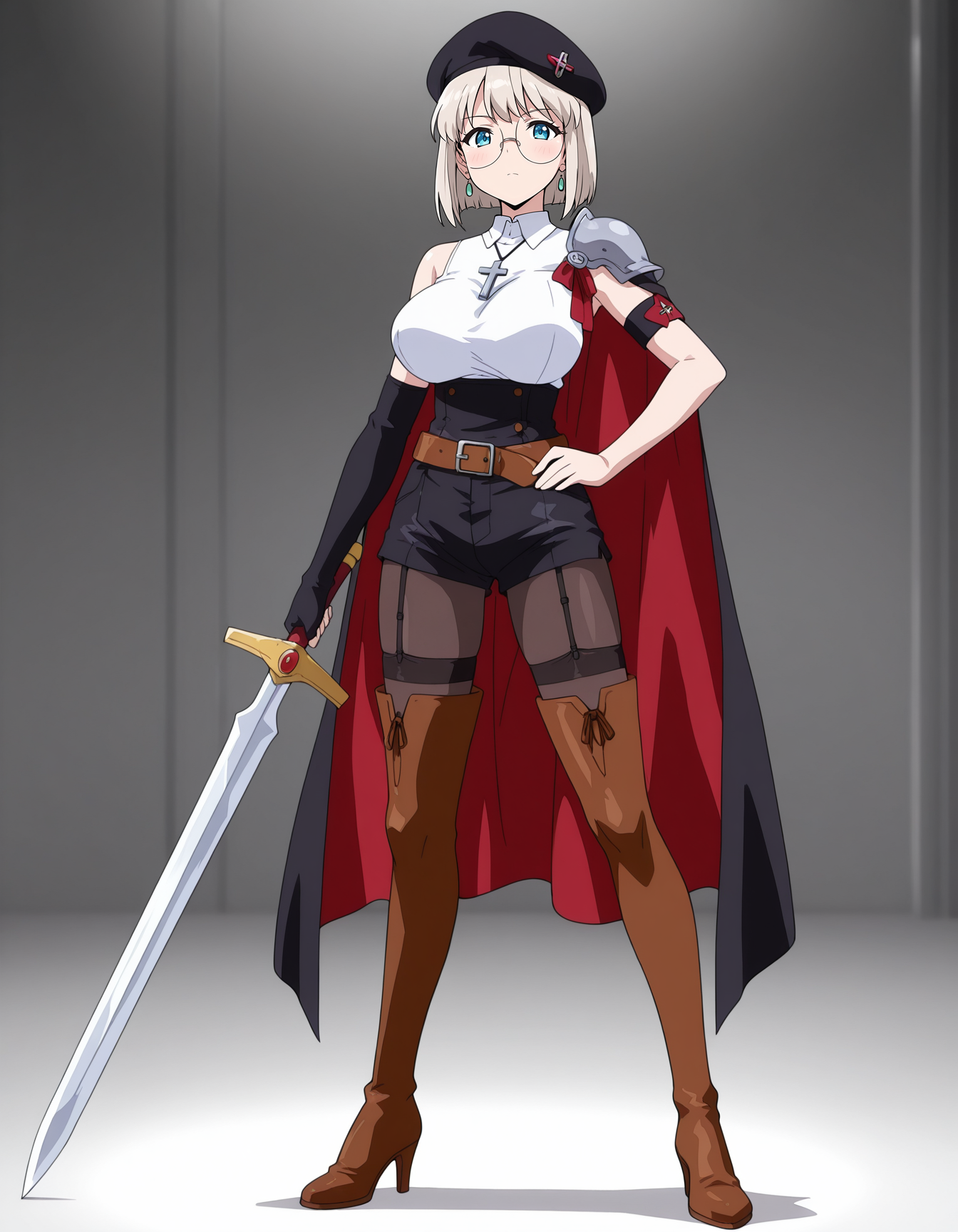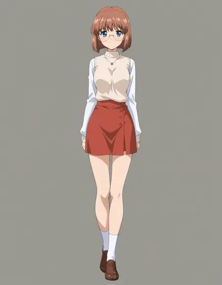 mai_rfsda,mai_fuukorf,aged_up,short_hair,brown_hair,blue_eyes,round_eyewear,rimless_eyewear,brown_sweater,sleeveless_sweater,necklace,white_shirt,long_sleeves_shirt,red_mini_skirt,white_socks,brown_footwear