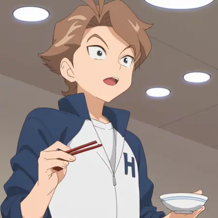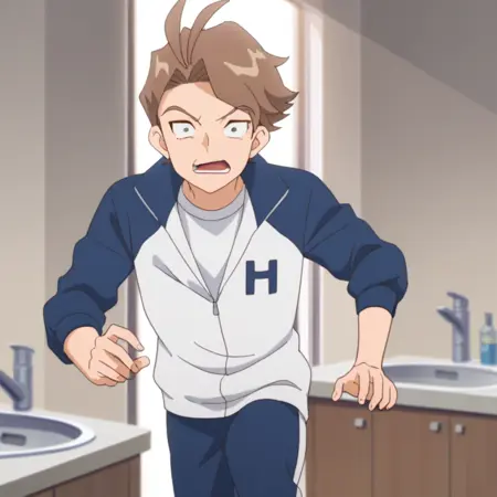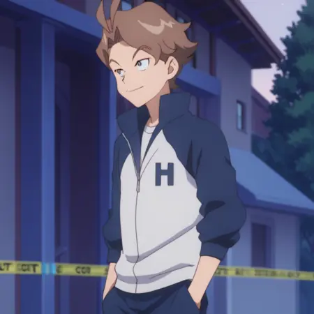 Outfit 2: male, brown hair, antenna hair, black eyes, track jacket, sleeves rolled up, white undershirt, track pants, white sneakers