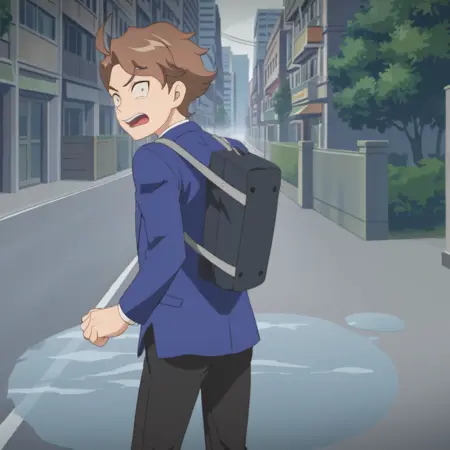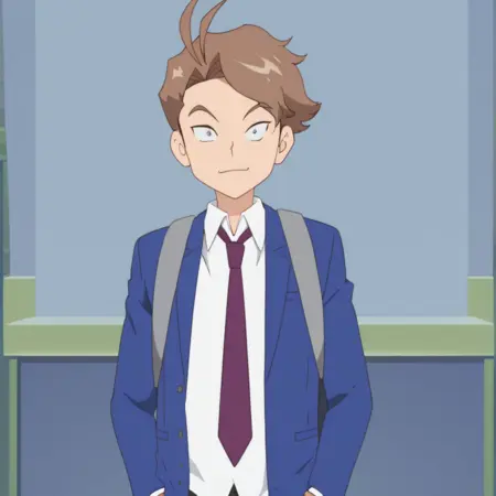 Outfit 1: male, brown hair, antenna hair, black eyes, school uniform, blazer, white collared shirt, long sleeves, open clothes, necktie, black pants, brown loafers
