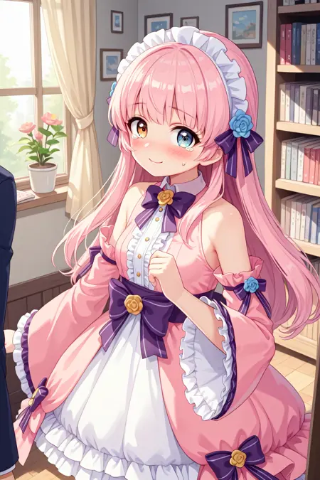 pink dress, frills, detached sleeves, wide long sleeves, sleeveless, bow, purple bow, bowtie, flower, maid headdress