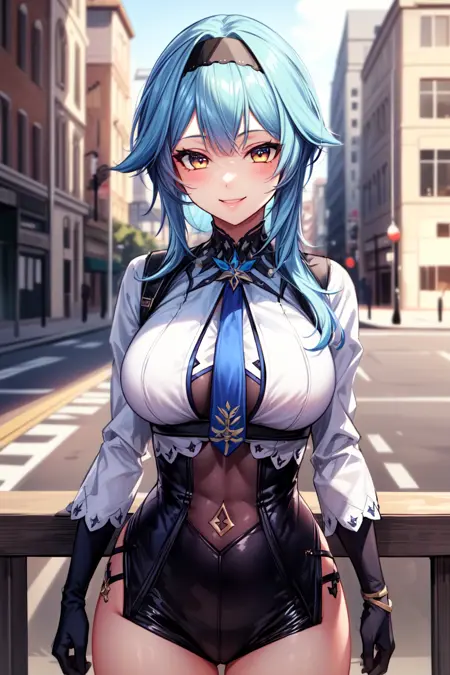 EulaGenshin_NDV, 1girl, blue hair, large breasts, medium hair, leotard, long sleeves, black hairband, blue necktie, blue gloves, purple-yellow eyes