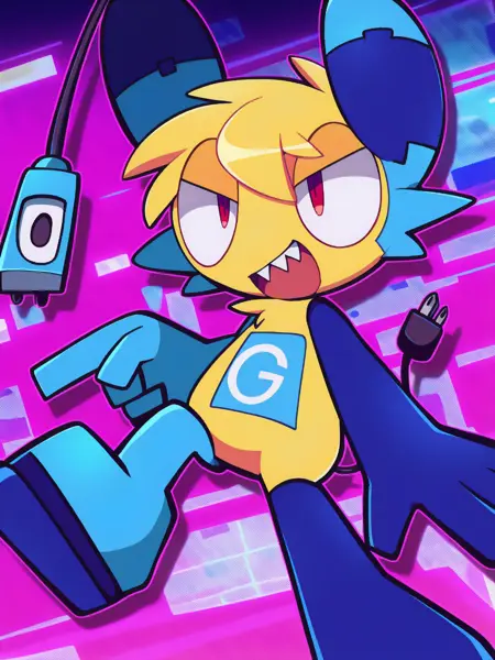 /gakuloid,机器人,黄色皮毛,蓝与深蓝四肢,蓝与深蓝耳朵,红眼睛,插头尾巴,尖牙