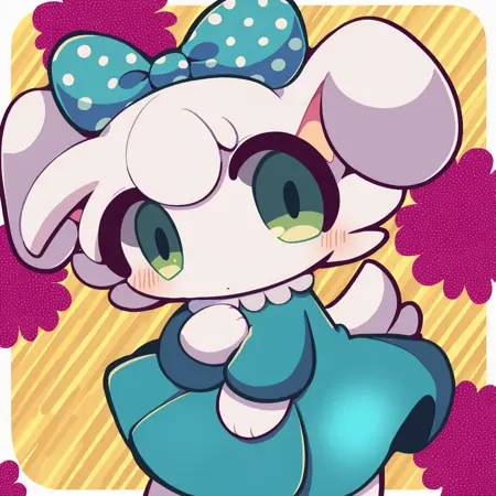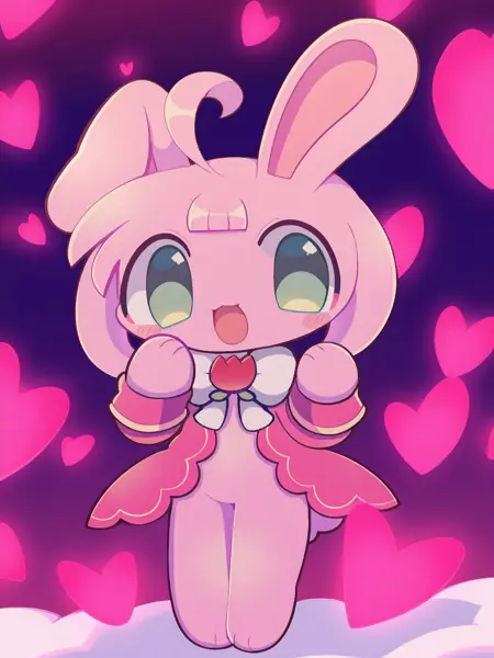 /allen,兔子,粉红色皮毛,绿眼睛,鲍勃发型,粉红色外套,红色郁金香宝石胸针,白色丝带