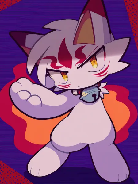 /izanari,狐狸,白色皮毛,红色面部纹路,火焰状尾巴,铃铛项圈,红白绳索项圈,黄色眼睛