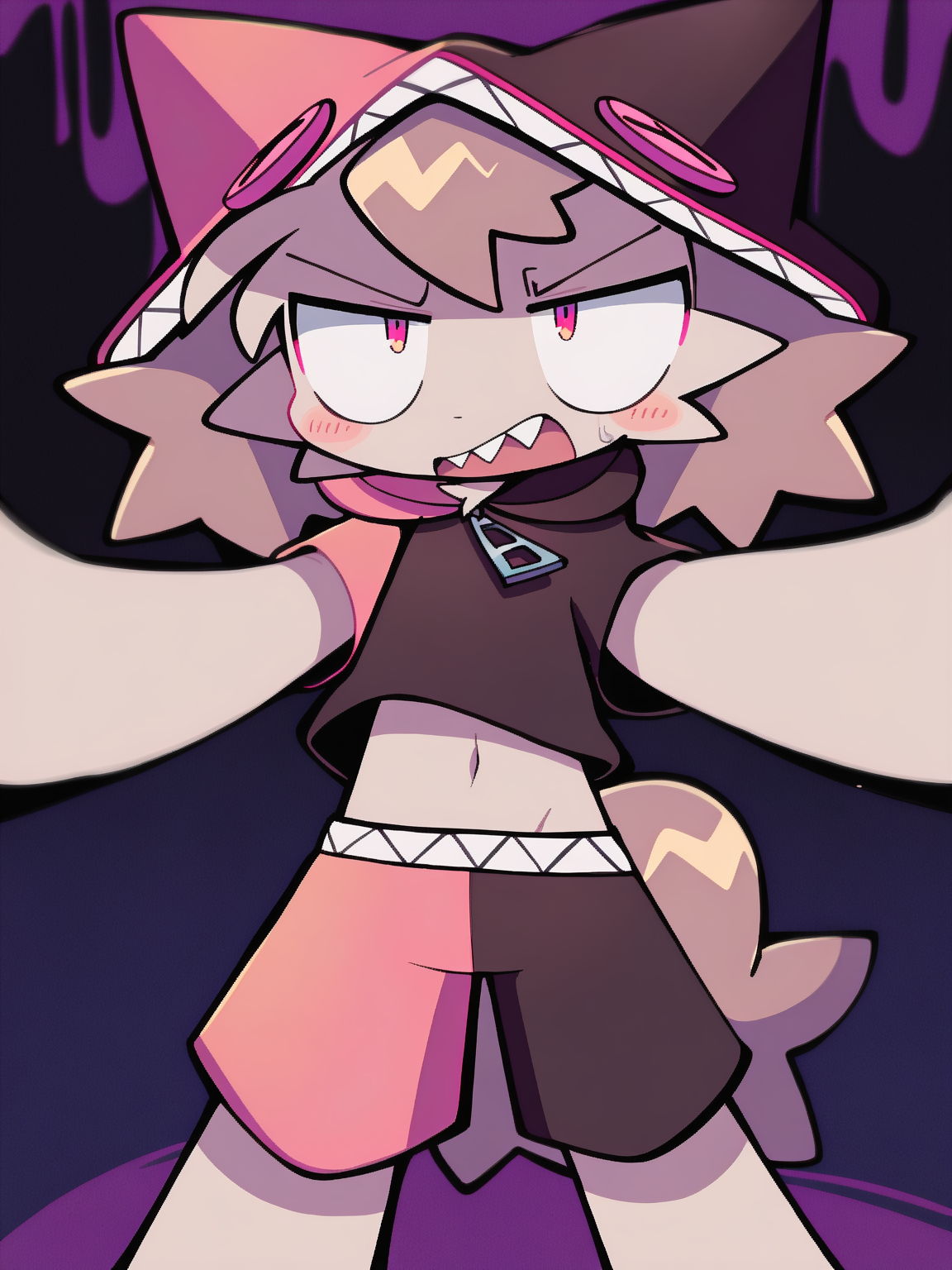/babio,狗,棕褐色皮毛,棕色尖刺发辫,尖刺额发,粉红色眼睛,粉黑相间猫款连帽衫,黑色上衣,粉黑短裤,尖牙