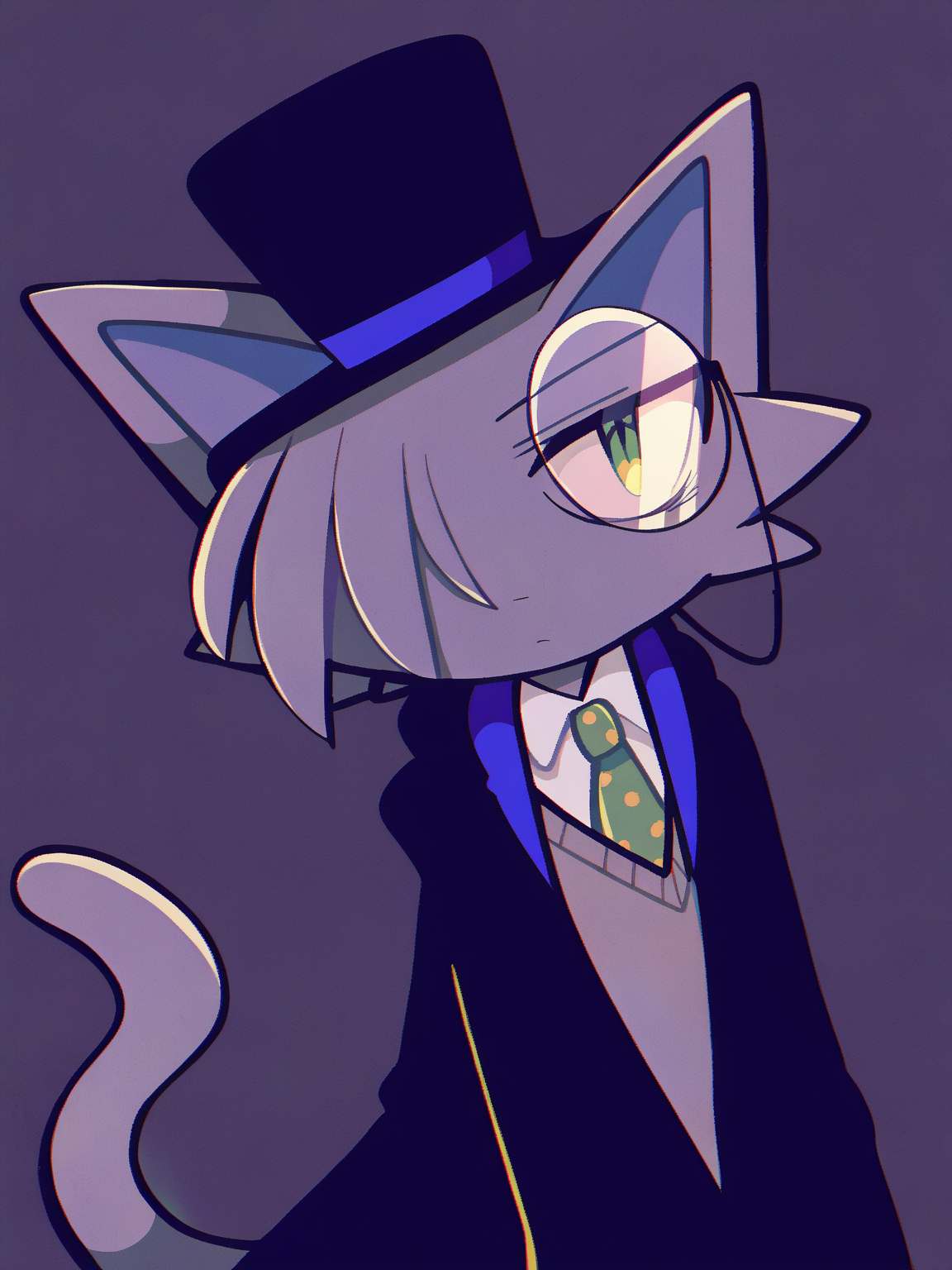 /lapis,猫,灰色皮毛,头发遮眼,绿眼睛,黑色长风衣,高顶帽,单片眼镜
