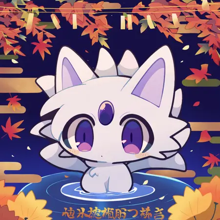 /kohaku, fox, white fur, nine tails, multi tail, purple eyes, purple forehead gem