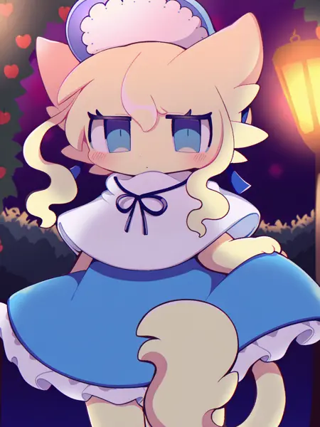 /alice, cat, light yellow fur, blue eyes, light blue dress, white capelet, light blue bonnet