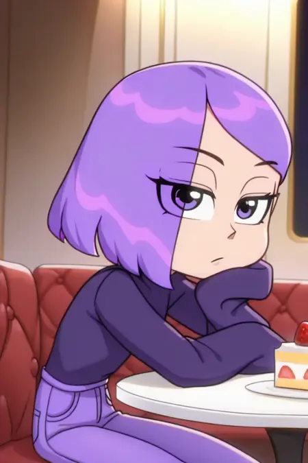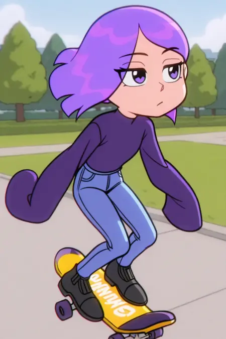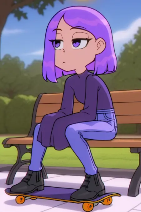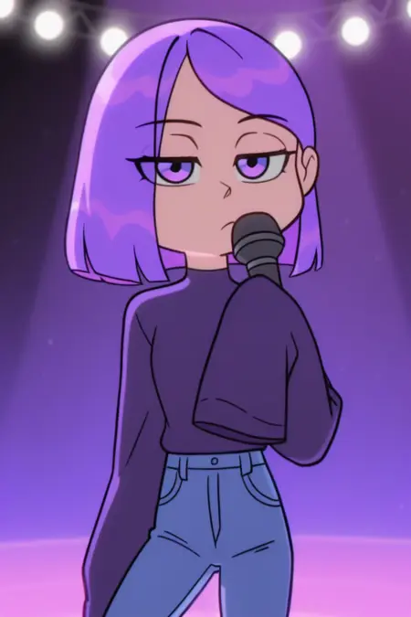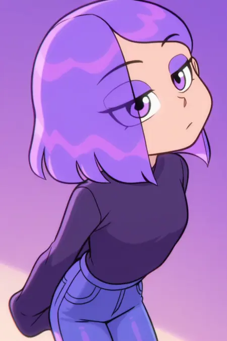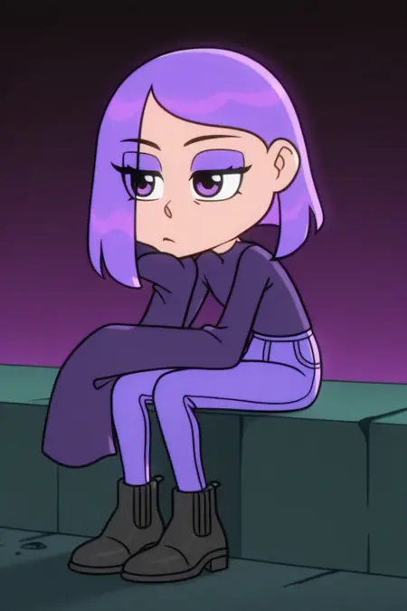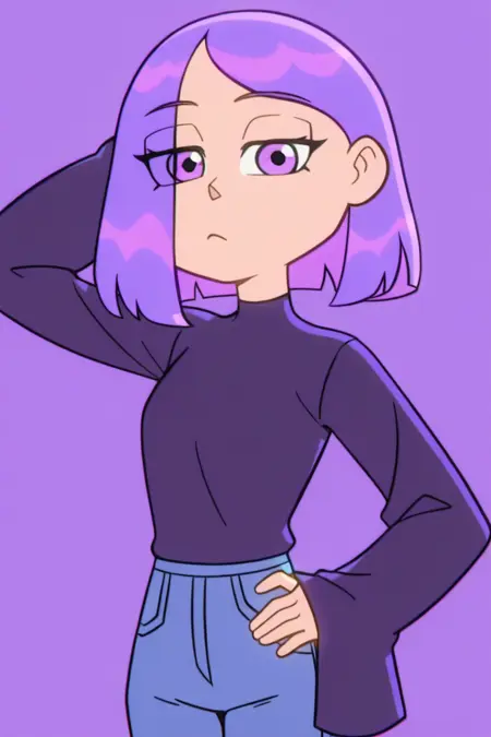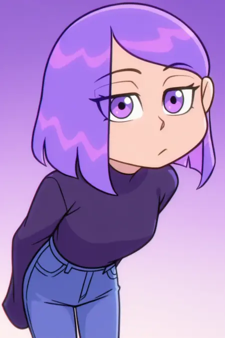 LilyZyN, 1girl, solo, bored, purple eyes, purple hair, short hair, sleeves past wrists, jeans, footwear