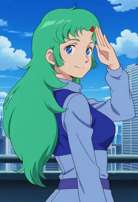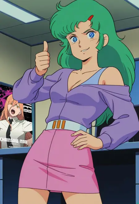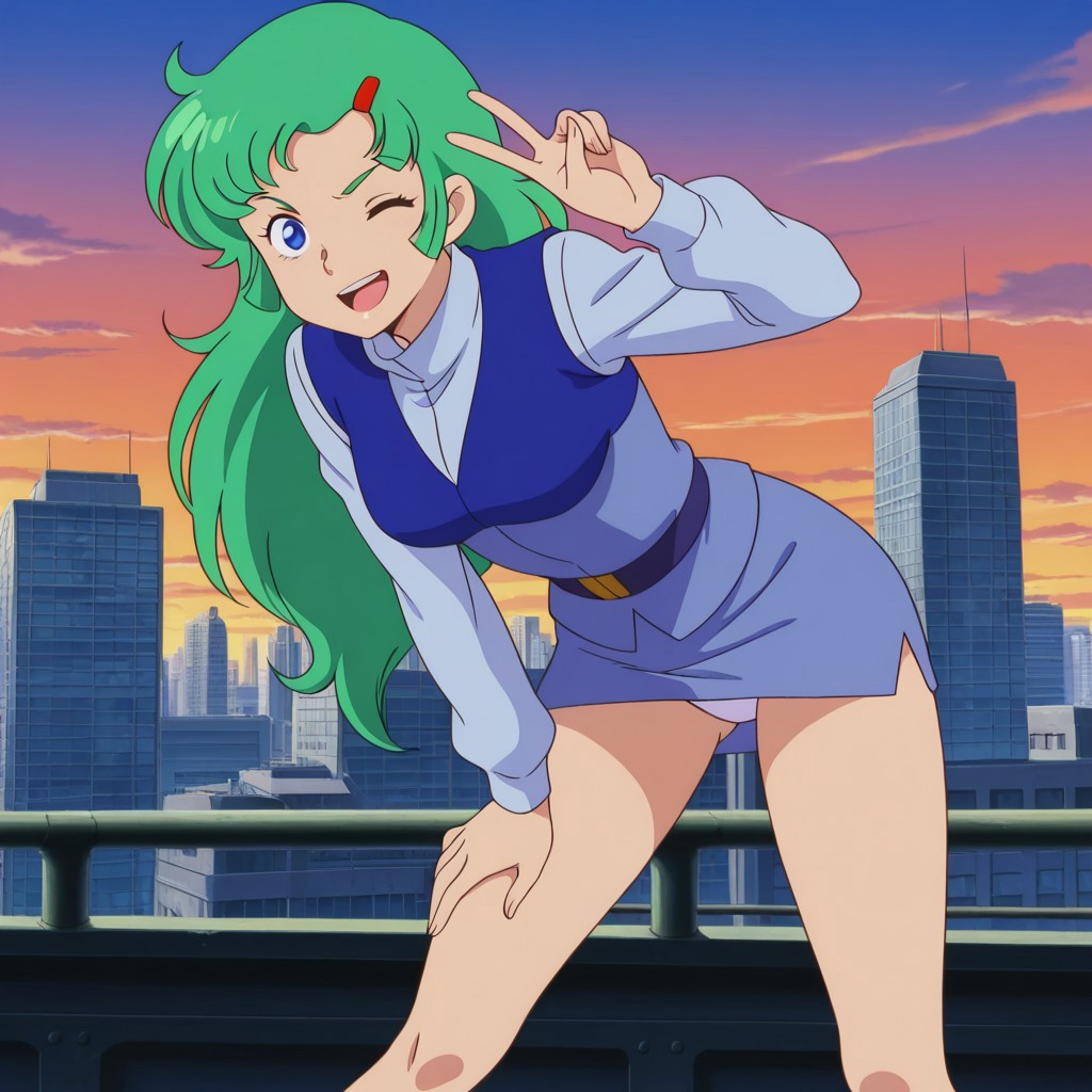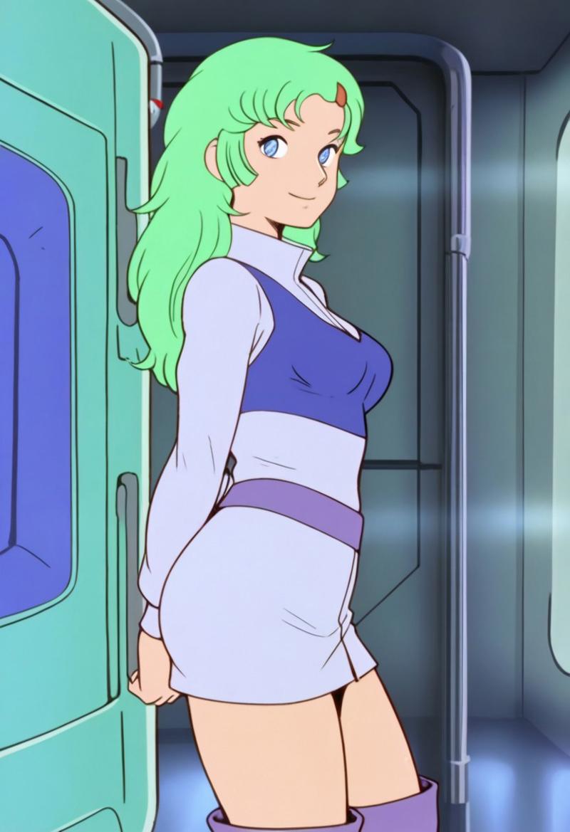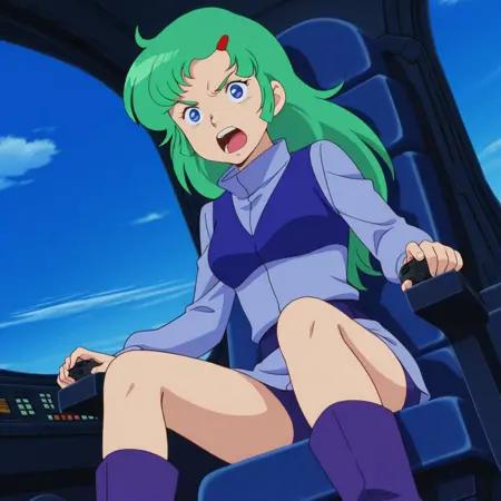🟢 1girl, elchi cargo, blue eyes, green hair, long hair, hairclip, medium breasts, long sleeves, miniskirt, purple boots, (Include Body & Normal outfit, but add Boots) [NOTE: also in NSFW have panty shot scene : panty shot,white panties, upskirt, ]