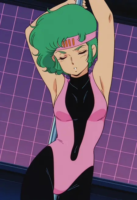 🔷 1girl, brainwashed elchi, green hair, blue eyes, headband, pink leotard, bodysuit