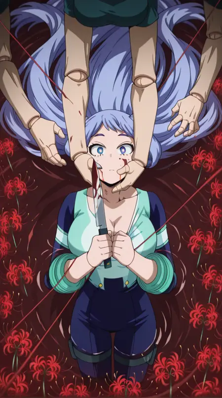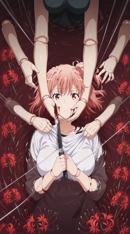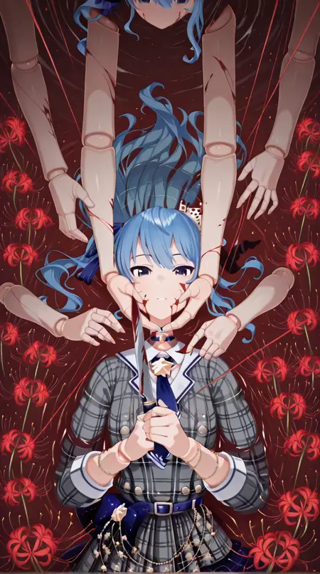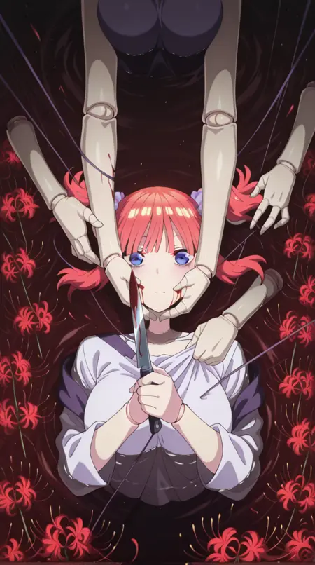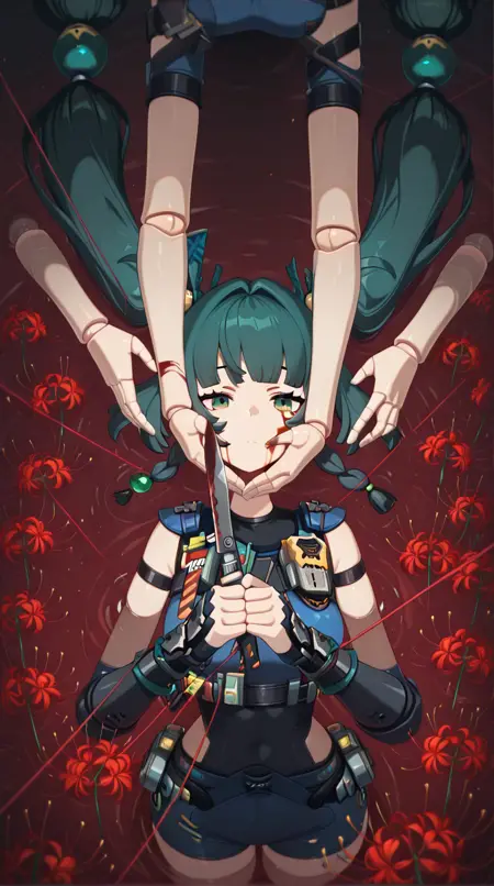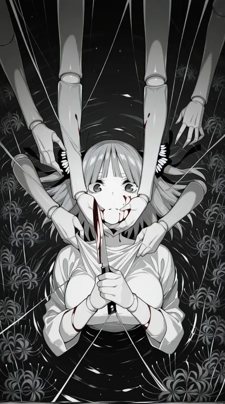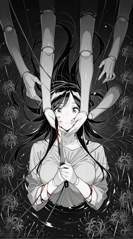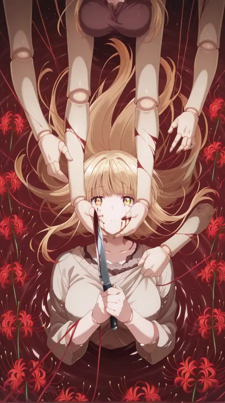 lora:mannequins-illustriousxl-lora-nochekaiser:1, mannequins, solo, looking at viewer, holding, flower, weapon, blood, red flower, knife, blood on face, holding knife, joints, string, doll joints, horror (theme), spider lily, hands on another's face, hands on another's cheeks, shirt pull, arm grab, partially submerged, water, floating hair, from above,