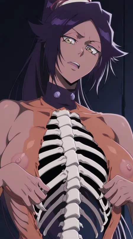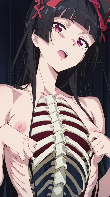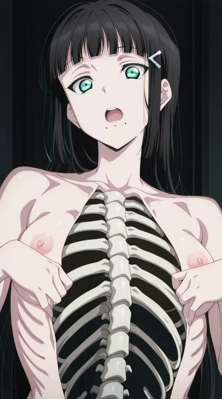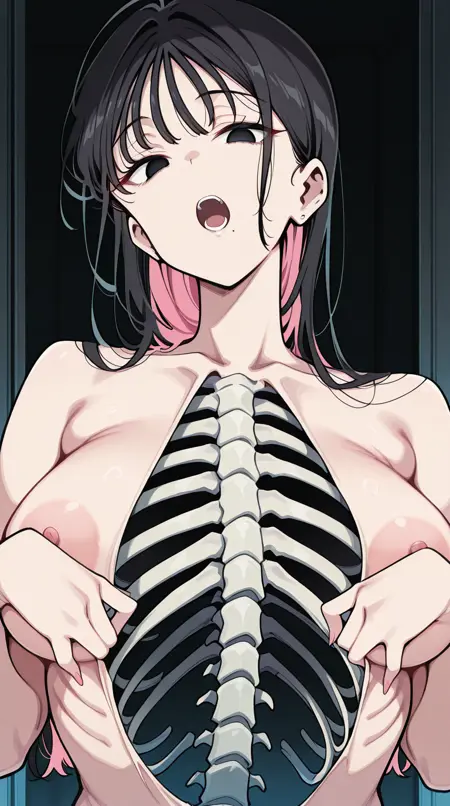 lora:open-chest-illustriousxl-lora-nochekaiser:1, open chest, solo, looking at viewer, nude, head tilt, ribs, spine, hands up, open mouth, looking down, nipples, completely nude, dark,