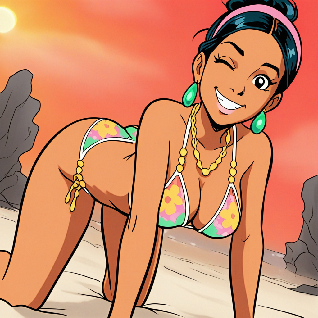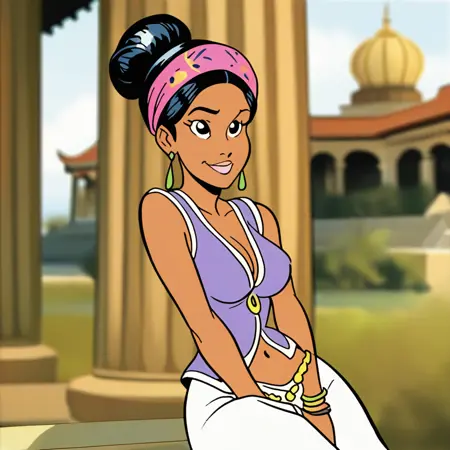 Appearance: tan skin, dark skin, light pink lips, big lips, green earrings, jade earrings, indian, princess, oriental, exotic, black eyes, arabian clothes, transparent background, breasts, lipstick, blue eyeshadow, medium breasts, red bracelets, green bracelets, submissive,