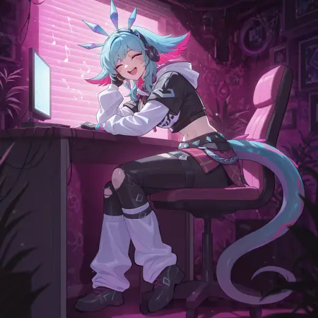 kdaneeko、黄色い目、分割された瞳、多色の髪、青い髪、黒いヘアバンド、頭部装飾、指なし手袋、破れたズボン、フードを下ろした、短めのフーディー、レッグウォーマー、靴、前髪、へそ、中程度の胸、白い袖、黒いショートトップ、顔の模様、内側に色のついた髪、青い尾