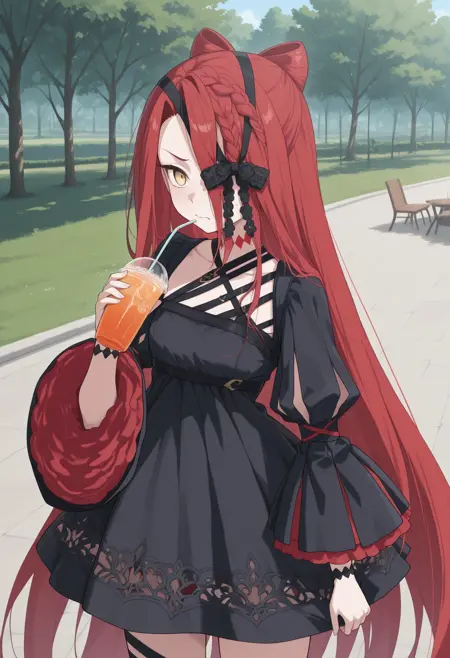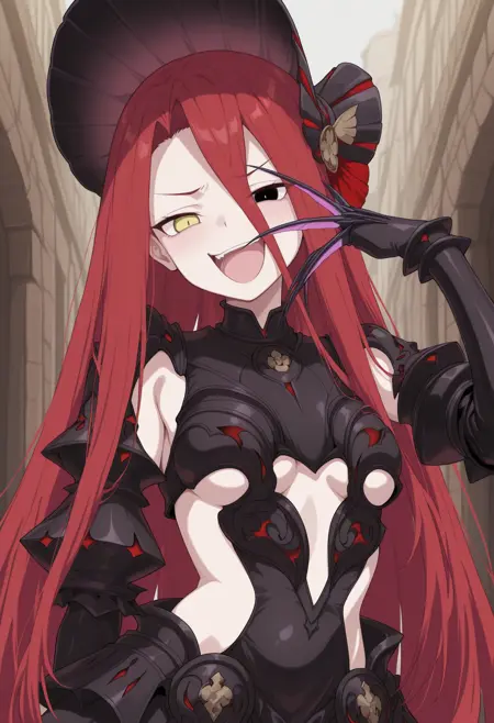 Original Goth: heterochromia, yellow eyes, black eyes, red hair, very long hair, bonnet, armored dress,underboob, belly cutout, armor, skirt