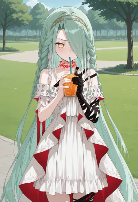 First ascension: green hair, twin braids, hair ornament, hair over one eye, yellow eyes, diadem, red choker, long dress, white dress, colored inner dress, red dress, bandaged arm, bandaged leg, black bandages