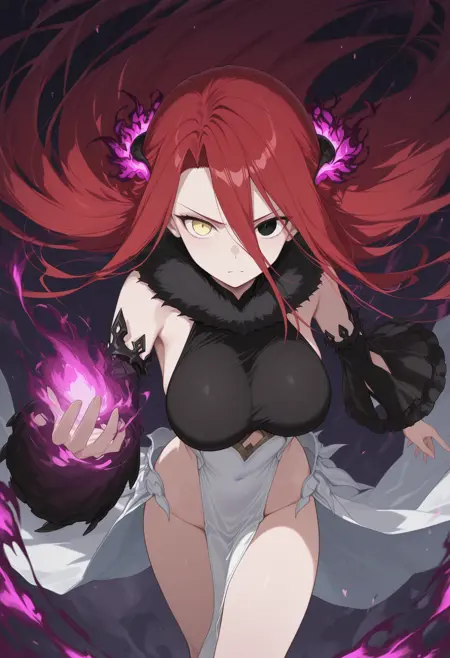 Original: heterochromia, yellow eyes, black eyes, red hair, very long hair, skirt, armor, topless, corruption
