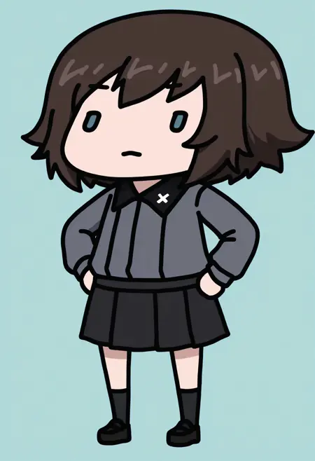 트리거: 1girl, solo, 짧은 머리, 검은 머리, 갈색 머리, 파란 눈