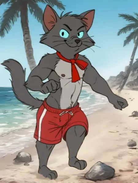 Berlioz, furry, furry male, anthro cat, dark gray fur, gray body, blue sclera, black eyes, muscular, huge muscles, abs, pecs, nipples, humanoid body, humanoid feet and hands, hands with palms, feet with soles, red ribbon around neck