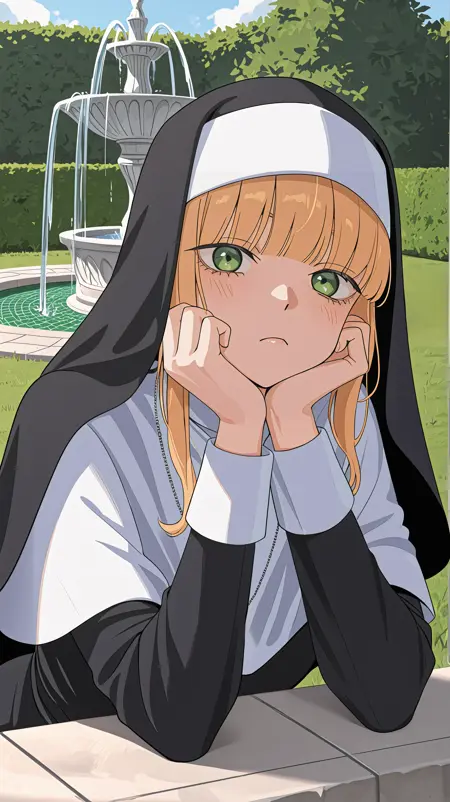 claire_mdud, blonde hair, blunt bangs, sidelocks, green eyes, nun outfit, cross necklace,