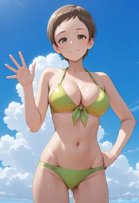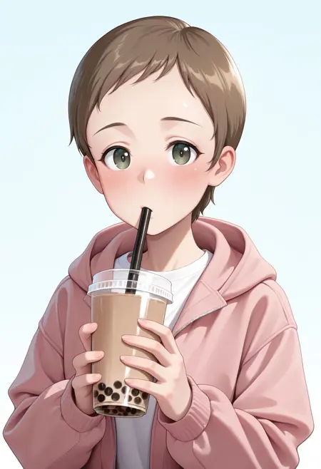 트리거: 1소녀 솔로, 갈색 머리, 매우 짧은 머리, 갈색 눈