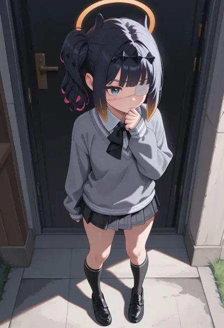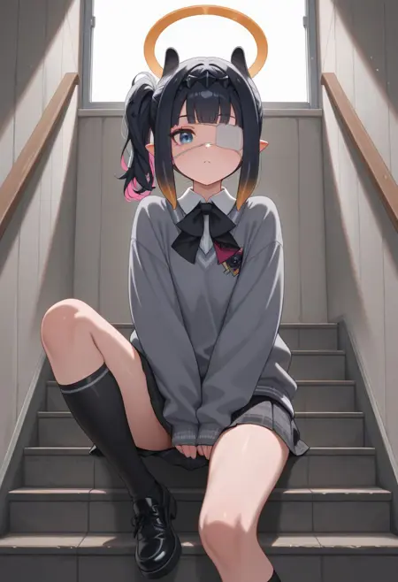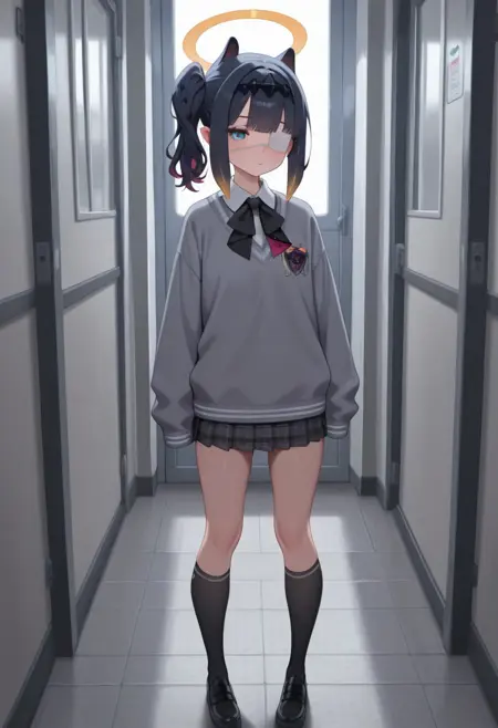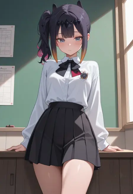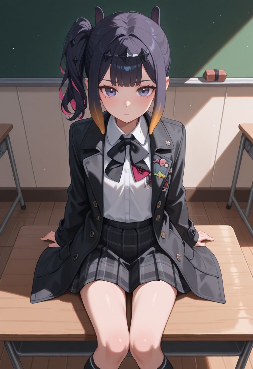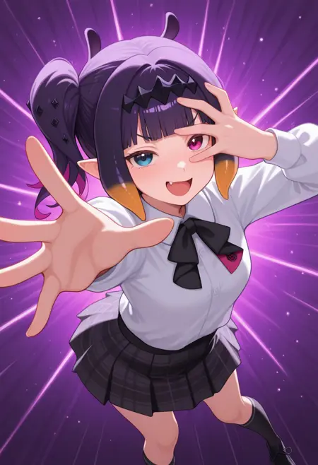 inastudent, pointy ears, purple hair, multicolored hair, tentacle hair, side ponytail, blue eyes, fang, black coat, grey sweater, black bow, collared shirt, plaid skirt, kneehighs, black socks, black footwear,