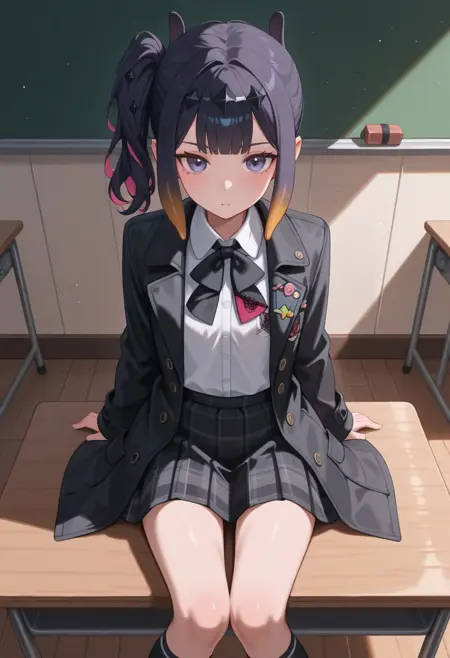 inastudent, 뾰족한 귀, 보라색 머리, 다채로운 머리, 암표 머리, 옆쪽 패션 테일, 파란 눈, 이빨, 검은 코트, 회색 스웨터, 검은 리본, 칼라 셔츠, 체크 스커트, 무릎 길이 양말, 검은 양말, 검은 신발,