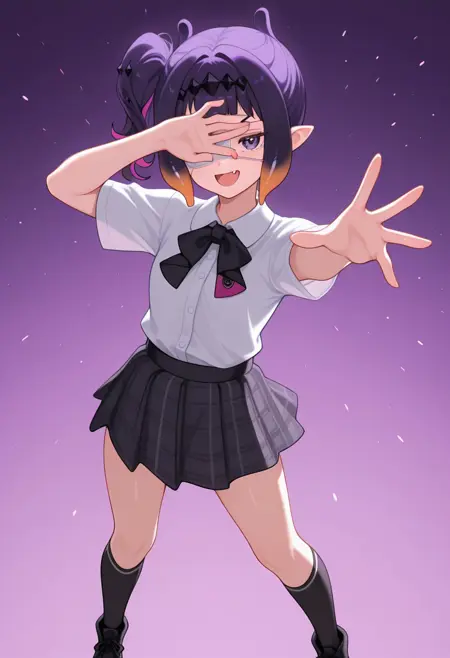 inastudent, pointy ears, purple hair, multicolored hair, tentacle hair, side ponytail, blue eyes, fang, white shirt, collared shirt, black bow, plaid skirt, kneehighs, black socks, black footwear,