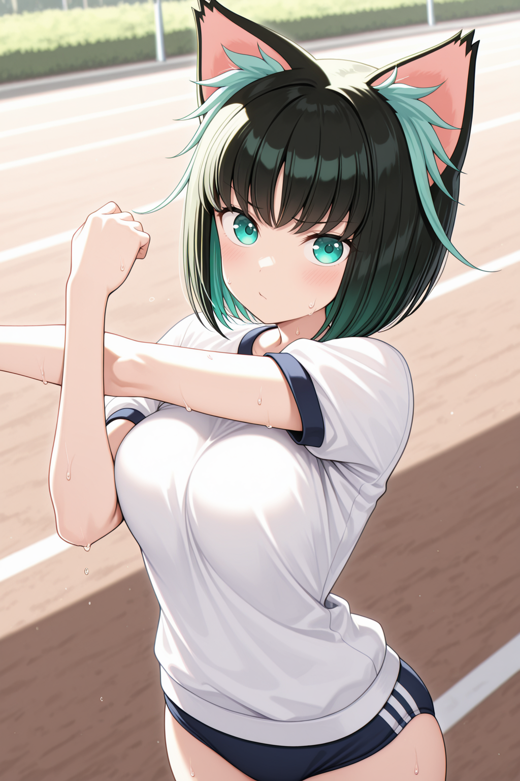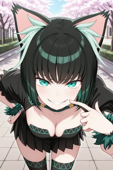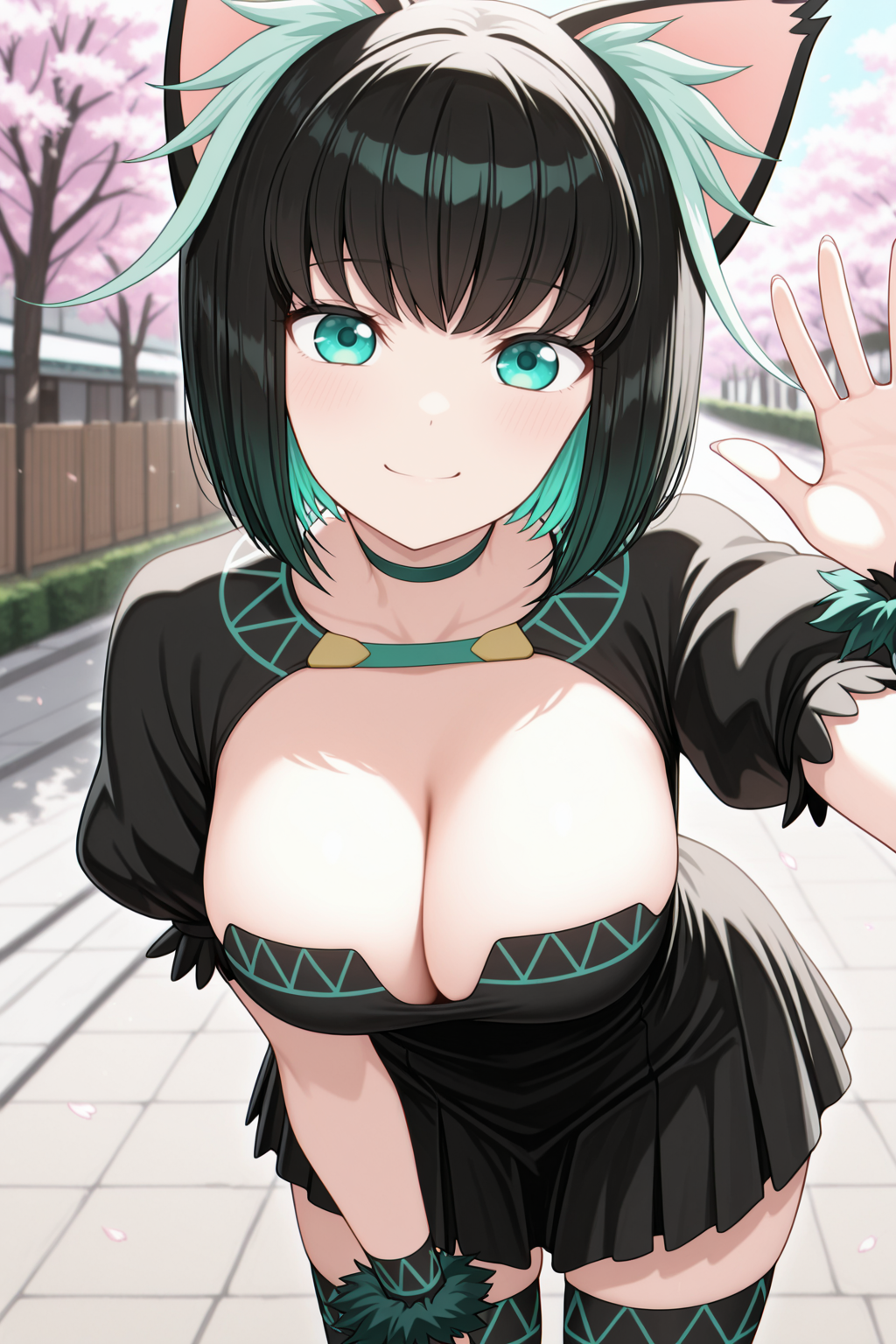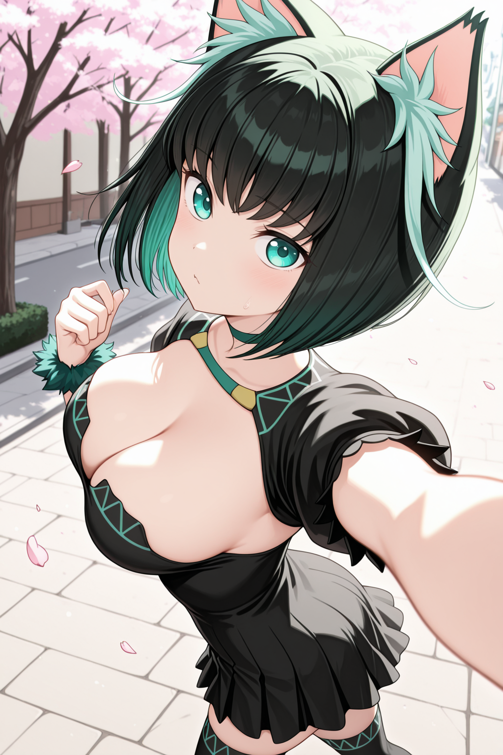 tama (isekai shikkaku), cat ears, animal ear fluff, multicolored hair, two-tone hair, black hair, green hair, bangs, short hair, aqua eyes