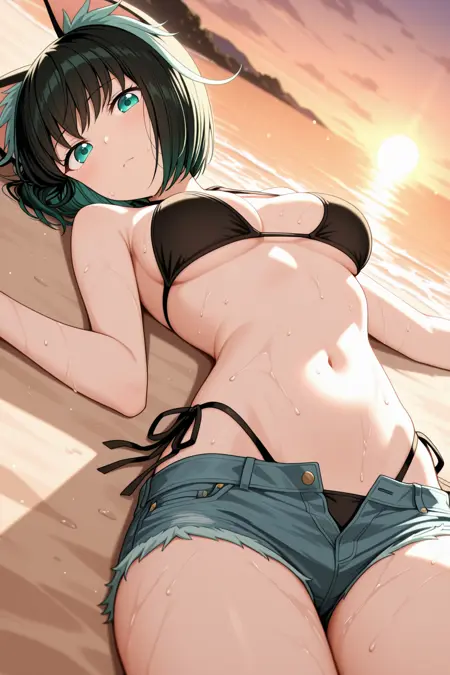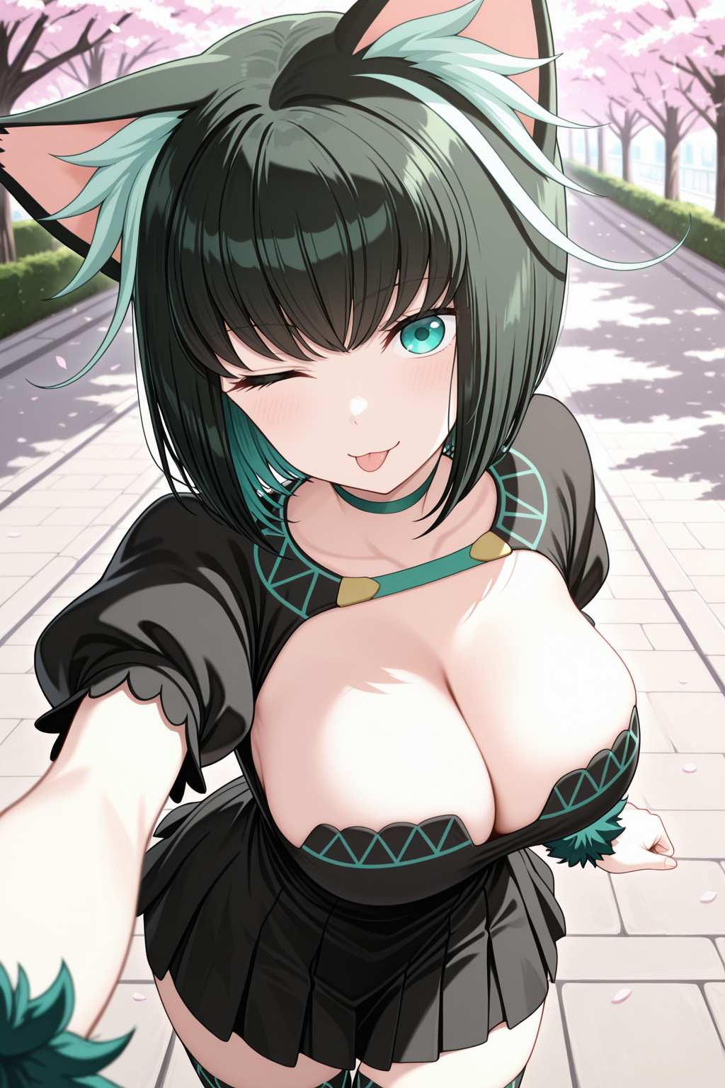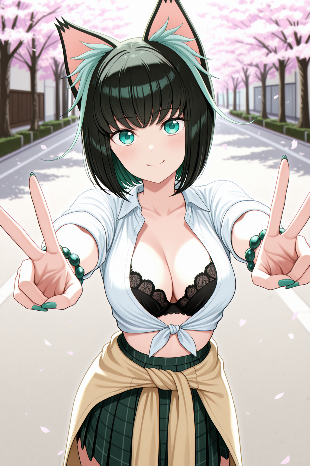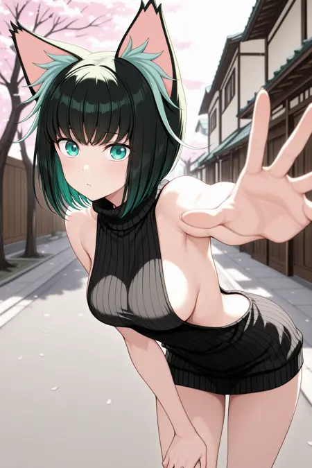 tama (isekai shikkaku), cat ears, animal ear fluff, multicolored hair, two-tone hair, black hair, green hair, bangs, short hair, aqua eyes