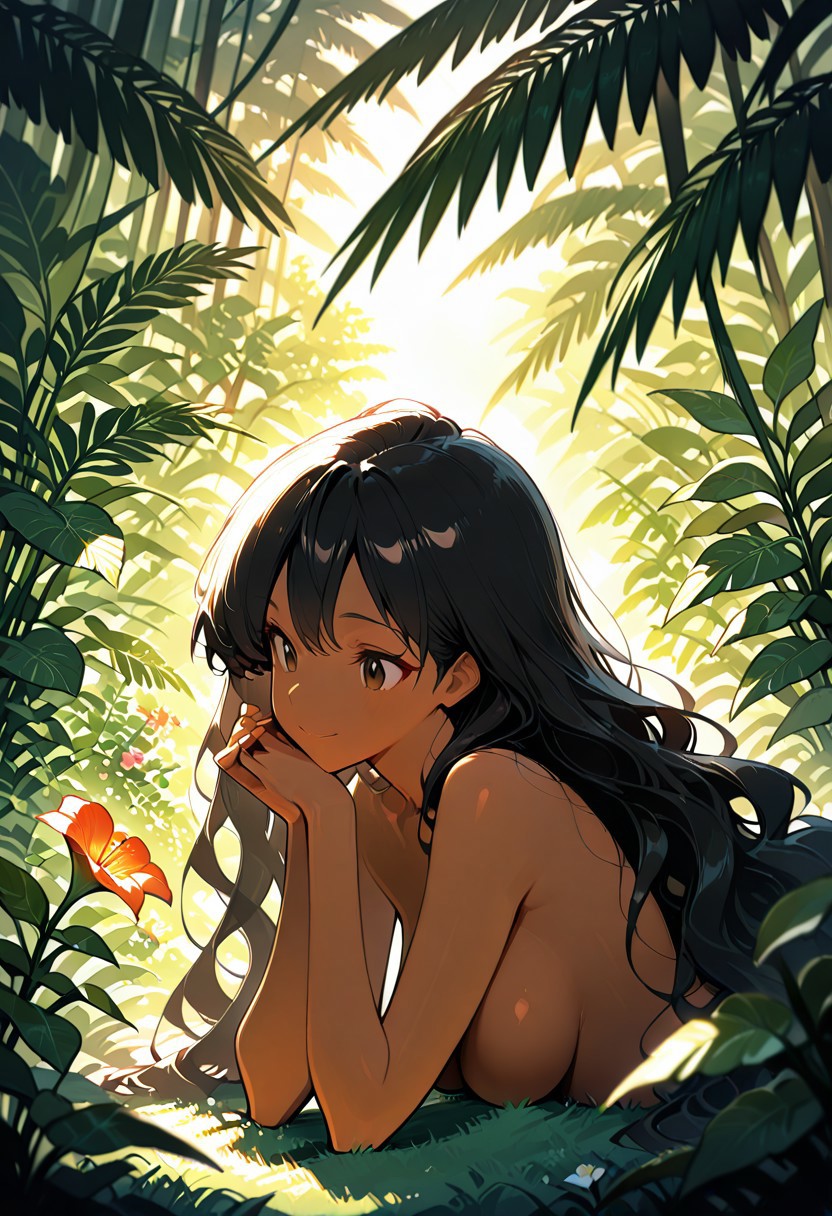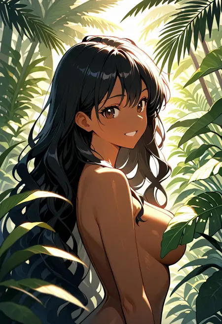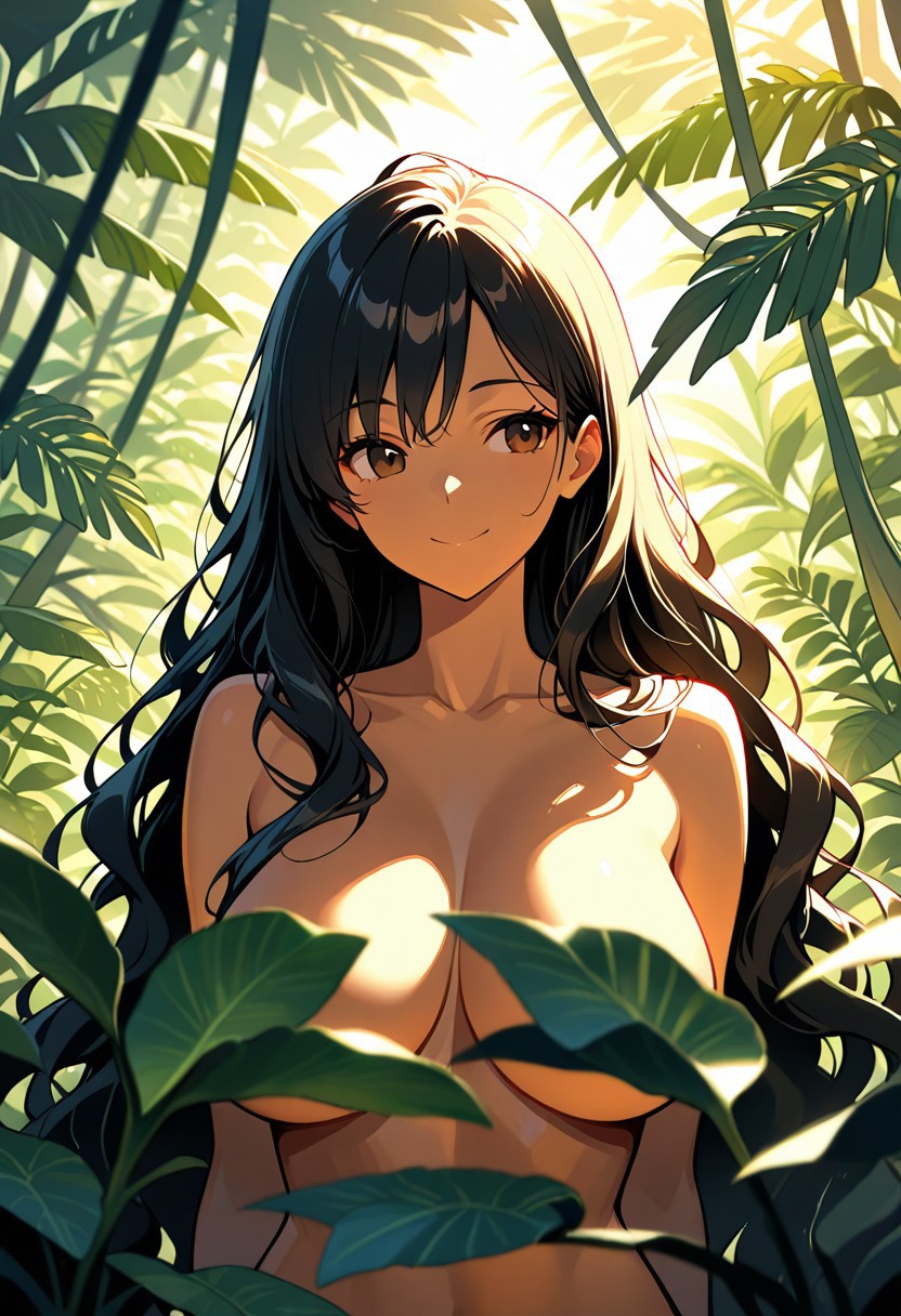 タグ例:1girl, solo, nude, (brown skin), girl, black hair, very long hair, wavy hair, brown eyes, many plants in the foreground, tall large leafy plant blocking view of her body in the foreground, large leafy plant in the foreground obscures her lower body, surrounded by plants, turning around, outdoor jungle, mist, lush tropical plants, lush jungle background, morning, surrounded by plants
