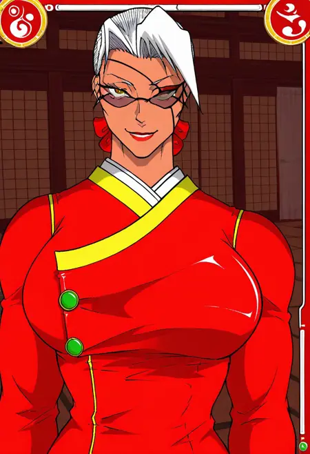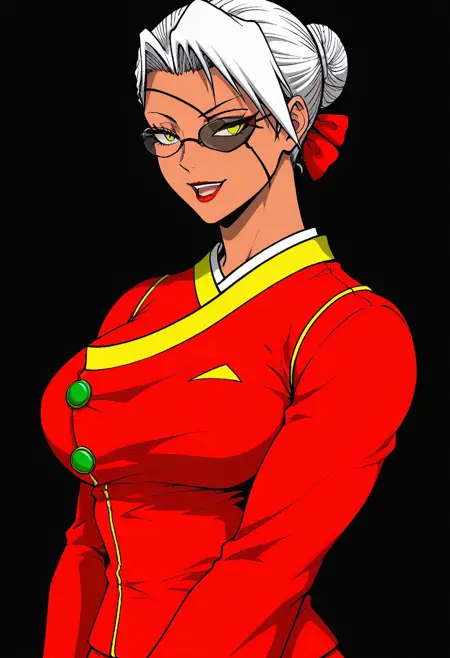 Kagashi,dark skin,white hair,hair bun,yellow eyes,eyepatch,glasses,lipstick,sunglasses,red ribbon,japanese red clothes,green buttons,large breasts
