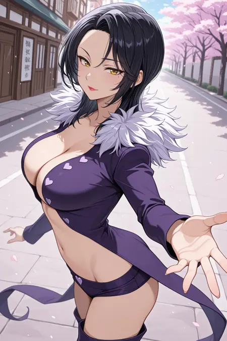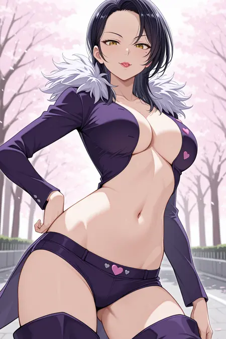 buttons, tailcoat, fur trim, revealing clothes, long sleeves, cleavage, cropped jacket, heart button, jacket, micro shorts, navel, purple jacket, purple shorts, purple thighhighs, thigh boots