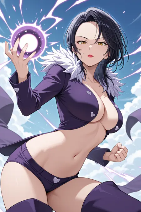 merlin (nanatsu no taizai), forehead, black hair, yellow eyes, medium hair, lipstick