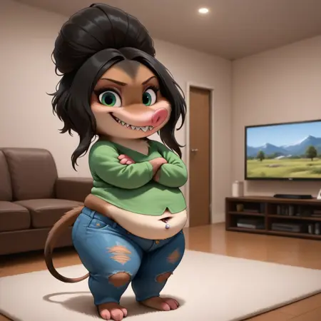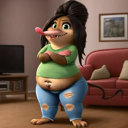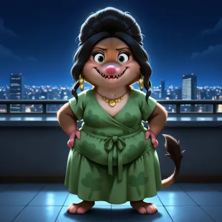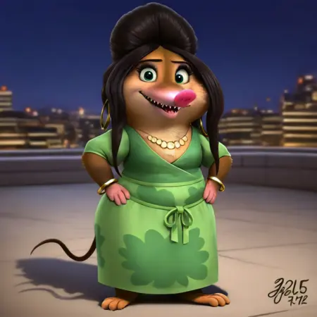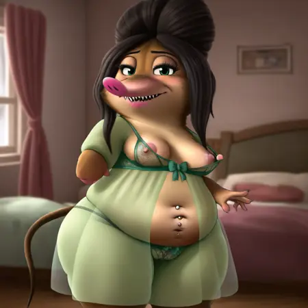 rodent, arctic shrew, brown fur, green eyes, black hair, bouffant hair, long snout, pink nose, sharp teeth, thin tail, chubby,