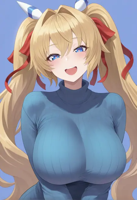 Appearance: Shine Mirage, blonde hair, long hair, very long hair, bangs, twintails, hair intakes, blue eyes, large breasts