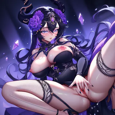 推荐标签:(VTuber_Unjaded, 长发, 黑发, 紫色眼睛, 发饰, 头发花朵, 角, 连衣裙, 暴露胸部, 肘部手套, 暴露胸部, 吊袜带, 网眼高筒袜, 高跟鞋),