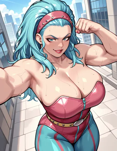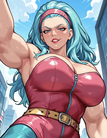 | 학습된 단어 | (angela-belti), (dark blue eyes, thick eyebrows, aqua hair, wavy hair, long hair, pink hairband, cheekbones, red lips, huge breasts, wide hips, thick thighs, thick legs, muscular female, plump), (pink leotard, aqua zipper, strapless, bare shoulders, yellow belt, jewelry, aqua pantyhose, pink boots)복사됨! |