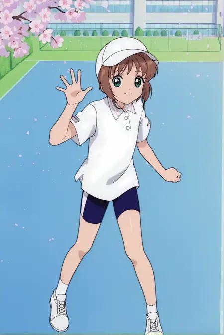 Gym: saki, gym, 1girl, green eyes, brown hair, short hair, white cap, white collar shirt, short sleeves, black buruma, white socks, white sneakers