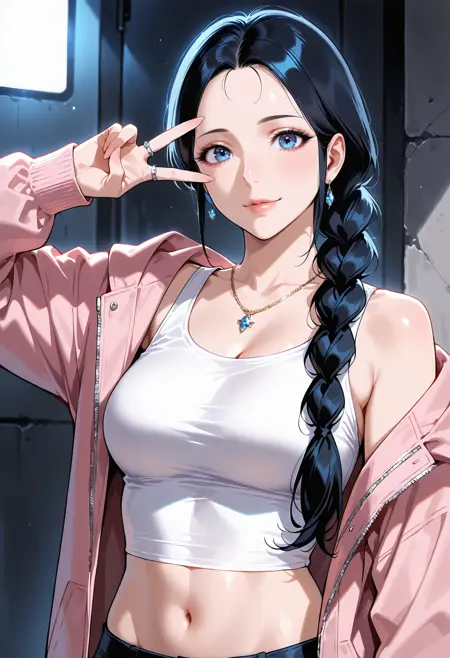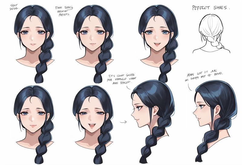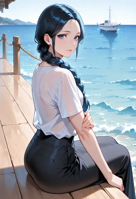 外观: 1个女孩,蓝色眼睛,黑色头发,蓝色头发,长发,辫子,单辫,辫子马尾,头发垂过肩膀