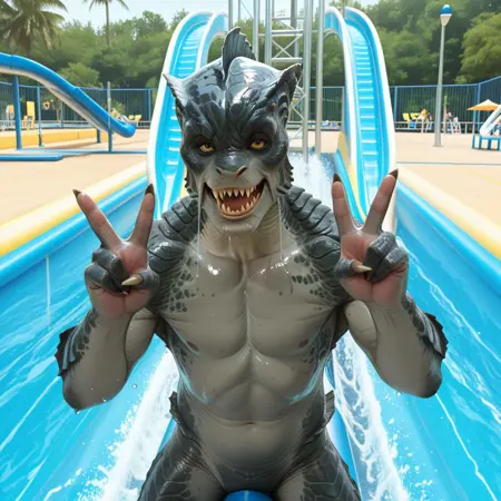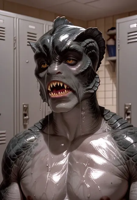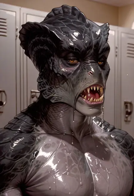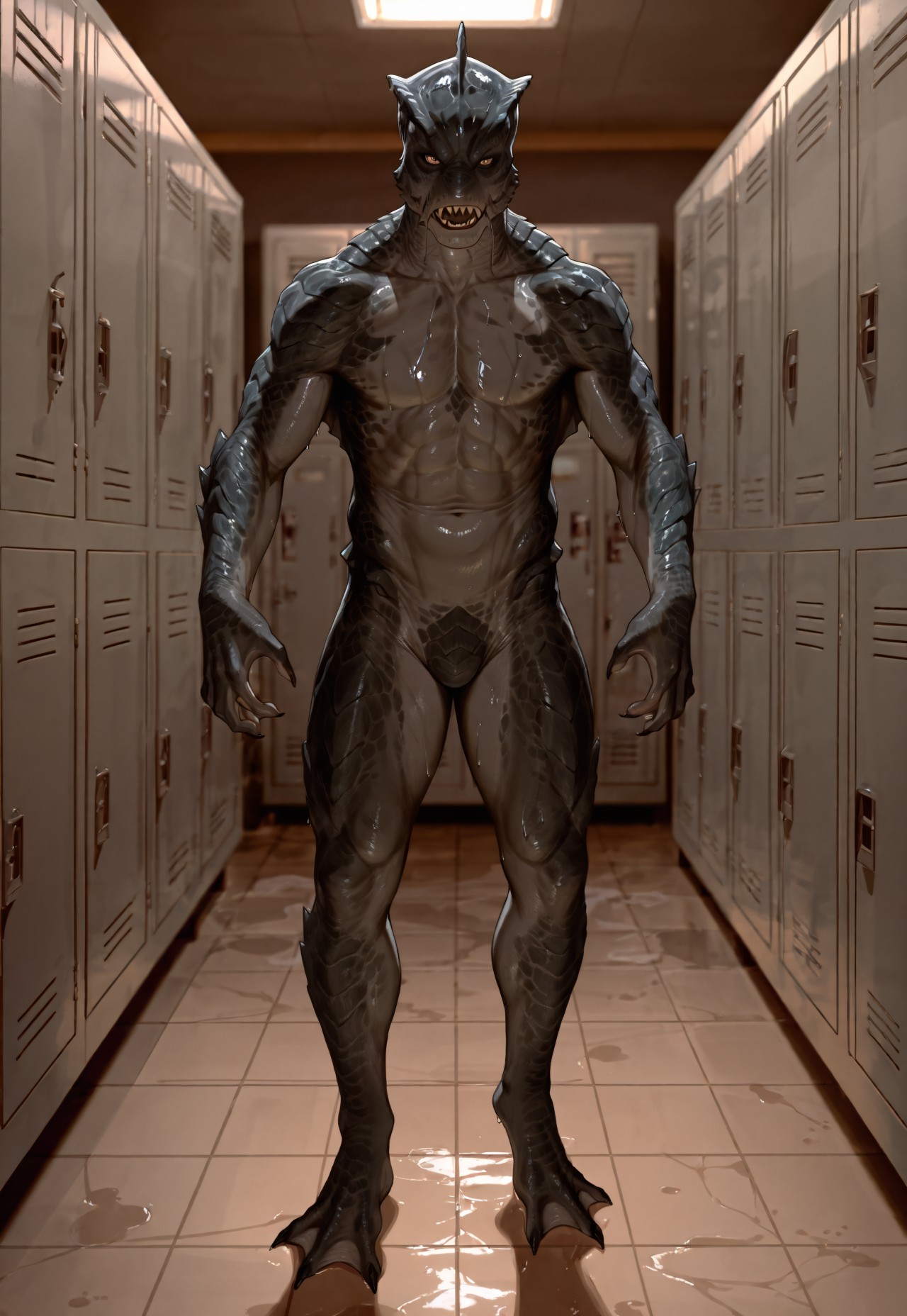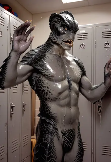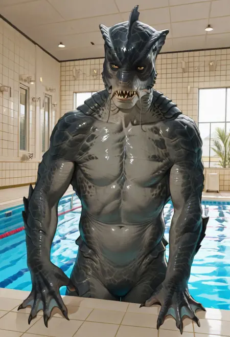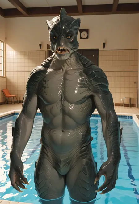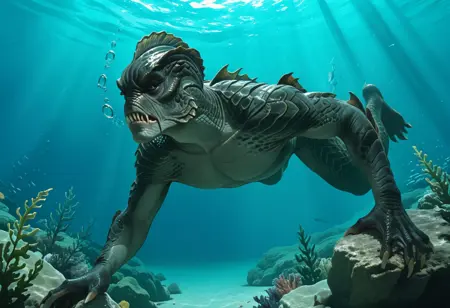 monster, scaly, grey body, barbles, claws, sharp teeth, webbed hands