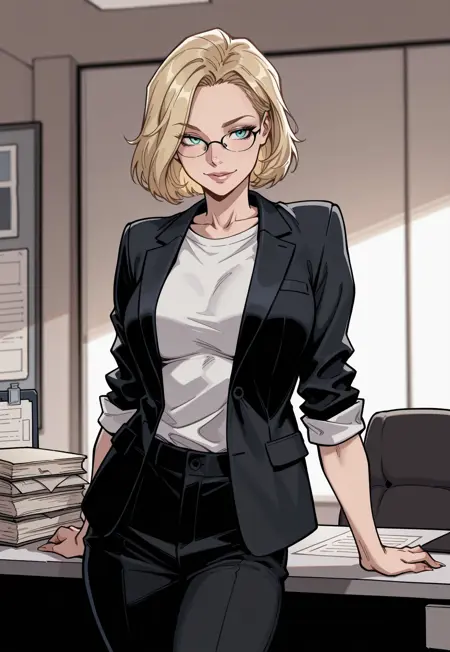 안경, 정장 자켓, 소매 말아올림, 흰색 셔츠, 정장 바지, 이름표, 시계,
