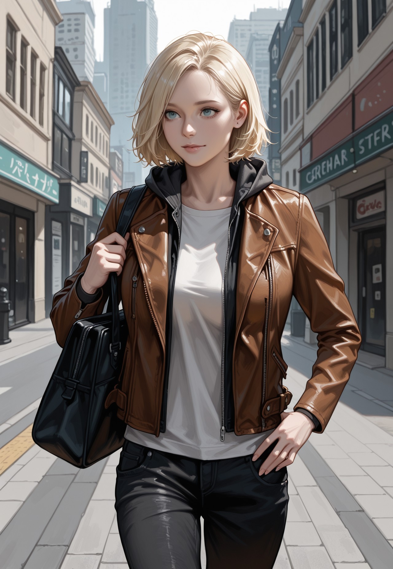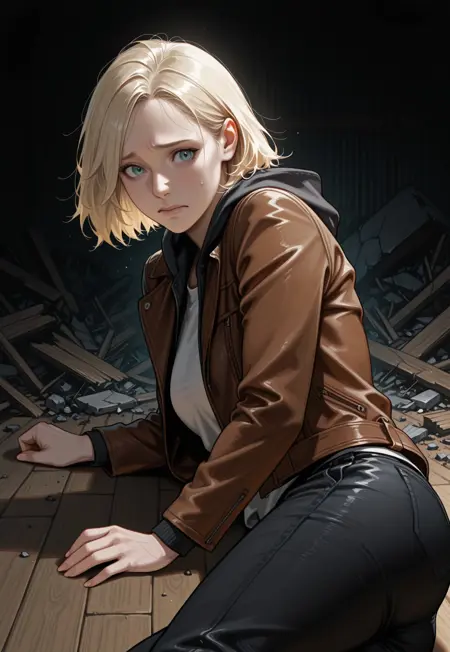 갈색 가죽 자켓, 후드티, 후드 내려짐, 흰색 셔츠, 검은 청바지,