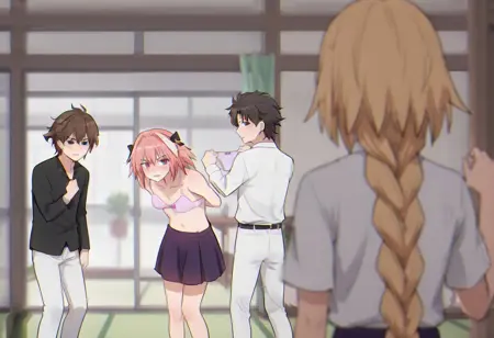 trigger: boy_character caught crossdressing by girl_character, sandwiched between left_character and right_character, bra, skirt, indoors, holding panties, clenching hand, 1girl, 3boys