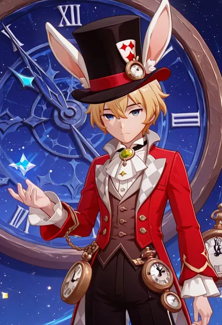 페어리랜드 프롬, 토끼 귀와 시계 디테일이 있는 빨강과 검정 색 톱햇, 짧고 흐트러진 헤어스타일, 흰색 러플 셔츠, 갈색 조끼, 흰색 소매가 있는 빨간 코트, 허리에 패지워치, 황금 테두리가 있는 검은 반바지, 흰색 무릎 위 양말, 검은 신발, 환상적, 원더랜드 테마 의상