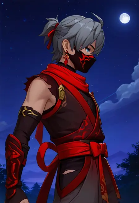 스칼렛 셰이즈, 금색 액센트이 있는 검은색과 빨간색 닌자 갑옷, 한쪽 눈 위에 앞머리가 있는 짧고 흐트러진 헤어스타일, 흰색 꽃 무늬가 있는 빨간 스카프, 어깨 보호대, 입 마스크, 귀고리, 검은 장갑, 갑옷 판이 있는 회색 바지, 검은 부츠, 자신감 있는, 은밀함 테마 전사 의상