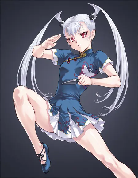 m_koryuu,long_hair,white_hair,twintails,red_eyes,,taiji_hair_ornament,blue_china_dress,blue_shoes